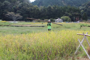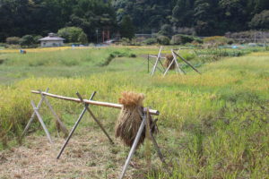 稲架用の材木を運んで田んぼにわきに準備しました。