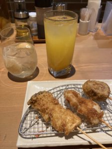 串揚げ3種盛り合わせは、牛肉とホタテとエリンギ。