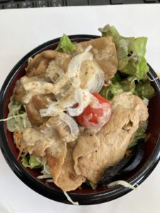最後に生姜焼きを盛りつけてから胡麻ドレッシングをかけます。