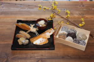 カラフルな玄米餅を入れたのは寿司の折り詰め箱で、