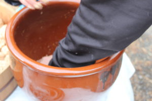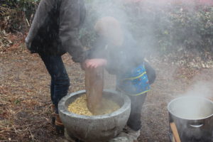 友人は薪で茹でた大豆をその場で石臼と杵でつぶしました。