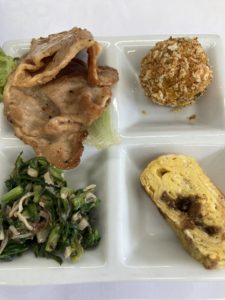 豚肉の生姜焼き、まぐろの佃煮入り厚焼き玉子と、