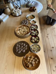 それぞれに持ち寄った料理をテーブルにに並べています。